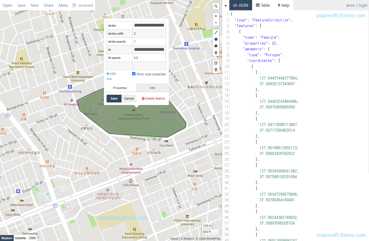 편집한 GeoJSON을 다른 포맷으로 저장하시려면 화면 상단에 보이는 Save 메뉴에서 해당 포맷을 지정하면 파일로 다운로드 받을 수 있습니다.