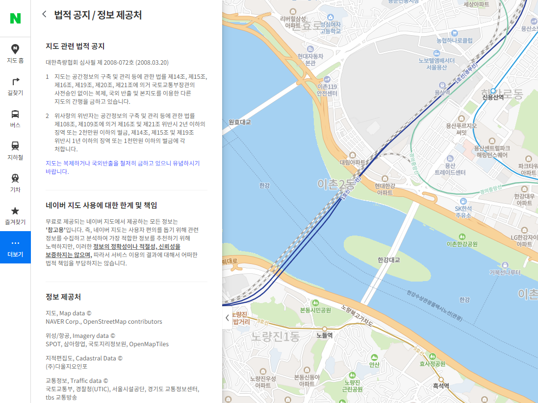 공간 정보를 조금 자세히 보신 분들은 네이버, 카카오 맵에 특정 지역이 표시되지 않고, 지도를 확대 축소할 때마다 지도 오른쪽이나 왼쪽 아래쪽에 데이터의 출처가 표시되는 걸 확인 할 수 있습니다.
