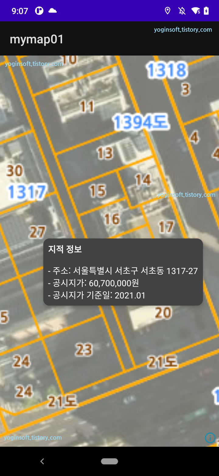 이 함수의 호출은 onMapReday에서 정의한 addOnMapClickListener 함수에서 getWFSJson를 통해 호출하도록 했습니다추후에 전체 소스와 데모 App을 앱스토어에 등록해서 알려드리도록 하겠습니다.
