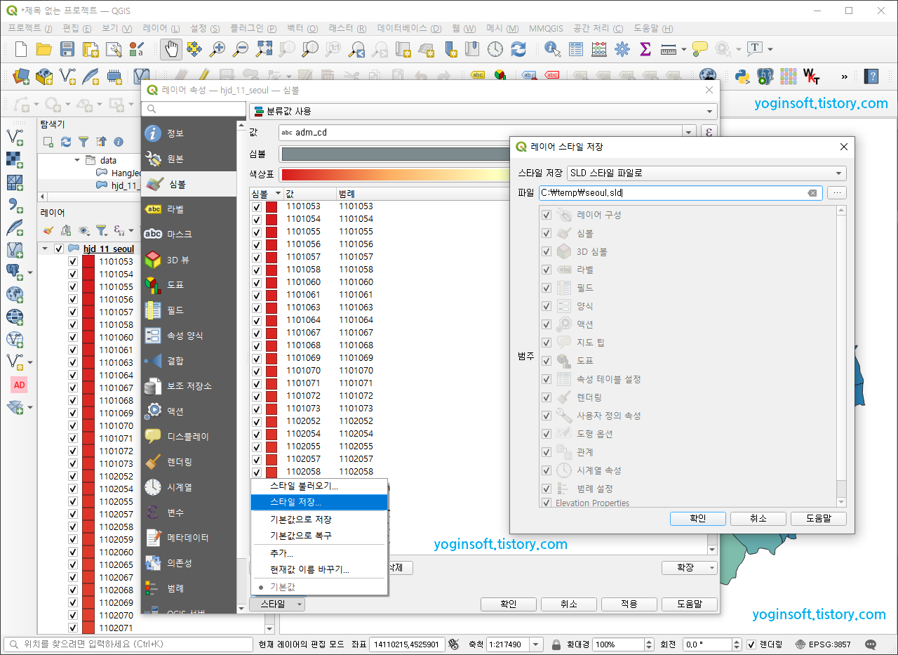 레이어 속성 > 심볼 설정 하단에 보이는 스타일 버튼을 누르면 "스타일 저장..." 메뉴가 표시됩니다.