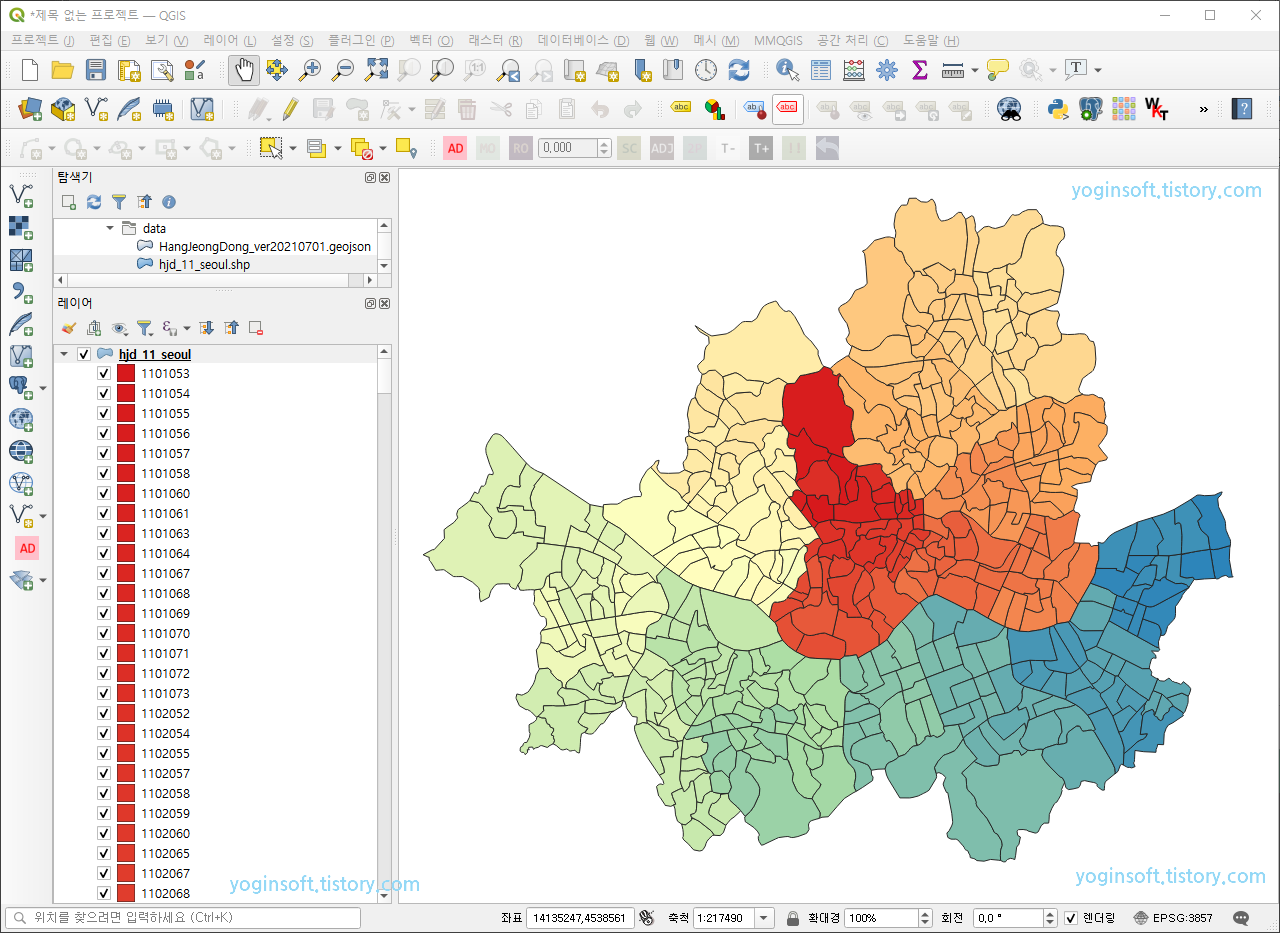 아래 그림에서 처럼, QGIS의 레이어 속성 > 심볼 설정을 통해 스타일을 지정하면 바로 확인이 가능합니다.
