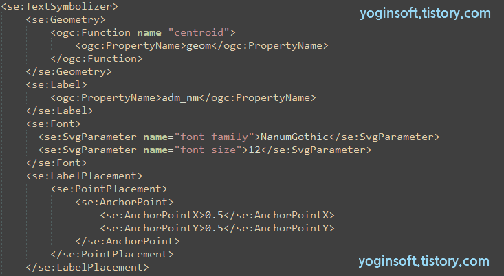 WMS 스타일 중 텍스트 라벨을 표시하기 위해서는 TextSymbolizer 설정을 하면 됩니다.