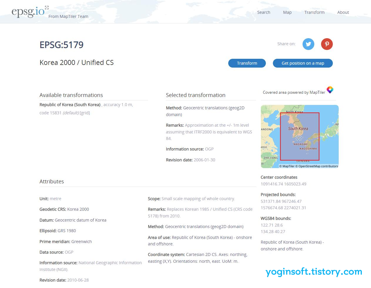 예를 들어, 네이버 지도, 네비게이션에서 많이 사용하는 좌표계는 EPSG:5179인데, 검색하면 아래처럼 해당 좌표계에 대한 자세한 정보를 확인할 수 있습니다.
