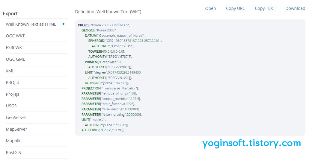 해당 좌표계를 ESRI, Geoserver, Proj4 등 다양한 형식으로 변환하는 기능도 제공합니다.