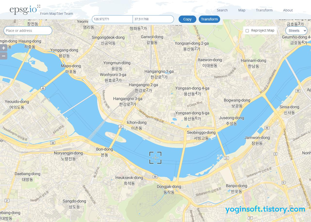 아래 그림처럼 지도에서 화면 중심좌표를 여러가지 좌표계로 확인 할 수도 있습니다.