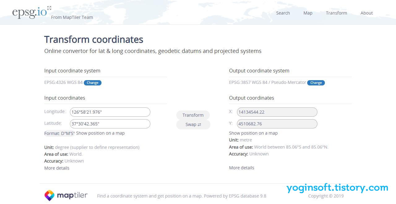 이러한 좌표변한을 간단하게 온라인에서 확인 할 수 있는 사이트가 있습니다. epsg.io 는 MapTiler라는 지도 제작, 온라인 서비스 업체에서 운영하는 사이트입니다. 로그인 하면 아래 화면처럼 좌표계 정보 조회, 좌표변환, 좌표 확인을 할 수 있습니다.