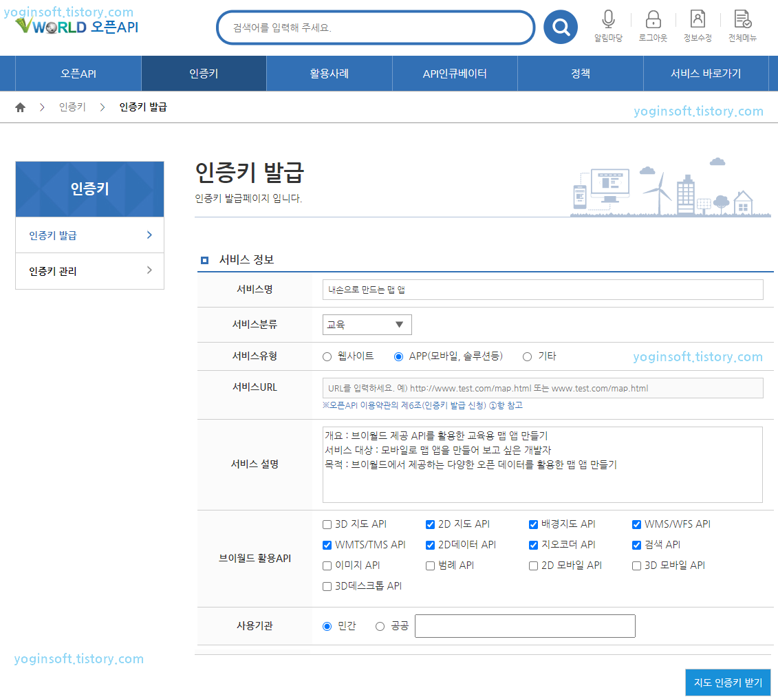 브이월드 가입 후 인증키 > 인증키 발급 메뉴를 통해 간단하게 인증키를 만들 수 있습니다.