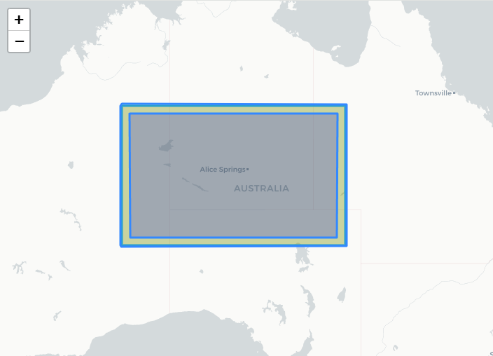 이 코드를 실행하면 호주 지도 위에 중첩된 세 개의 다각형이 표시되며, 각각 다른 색상으로 구분됩니다. 이러한 버퍼 연산은 지리적 분석이나 영역 계산에 유용하게 사용될 수 있습니다.
