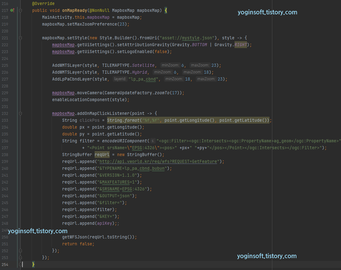 이번 글은 내가 지도에서 터치한 곳의 공시지가를 확인하는 코드입니다. 이번 글도 이전 MapLibre 강좌와 이어집니다. 공시지가를 확인 하는 방법은 여러가지가 있겠지만, 국토교통부 브이월드 서비스에서 제공하는 OpenAPI를 활용하는 방법으로 코드를 작성했습니다. 가져오는 내용은 선택위치의 지번주소와 공시지가, 공시지가 기준월을 브이월드 WFS 서비스를 통해 가져옵니다. 주요 코드부분은 맵이 준비가 되면(onMapReady), 맵 클릭 이벤트 핸들러를 등록해 줍니다. 맵 클릭 이벤트에서 해당 포인트의 경위도 좌표를 획득하고 브이월드 WFS 요청 URL을 생성합니다. 브이월드 WFS URL 요청문 설명 페이지를 참고하셔서 해당 구문을 작성하시면 됩니다. 이 예제에서는 filter 구문을 활용해 WFS U..